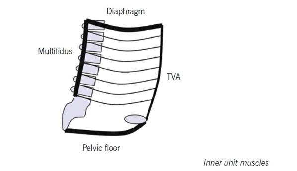 This layer is made up of quite a few muscles. Your TVA is, essentially, all your abdominal muscles. Your internal obliques are the bad boys to the side of your abs.Lumbar multifidus, back muscles. The diaphragm, which allows you to breathe and your pelvic floor (which all women who have ever had a baby will know about), all make up your inner layer. This layer protects your spine and stabilises it so that you can move your arms and legs without waddling all over the place. This is the layer that is very important if you ever want to be good at any sports.
